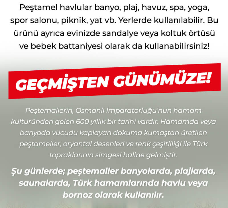 Peştemallerin, Osmanlı İmparatorluğu’nun hamam kültüründen gelen 600 yıllık bir tarihi vardır. Hamamda veya banyoda vücudu kaplayan dokuma kumaştan üretilen peshtemaller, oryantal desenleri ve renk çeşitliliği ile Türk topraklarının simgesi haline geldi.